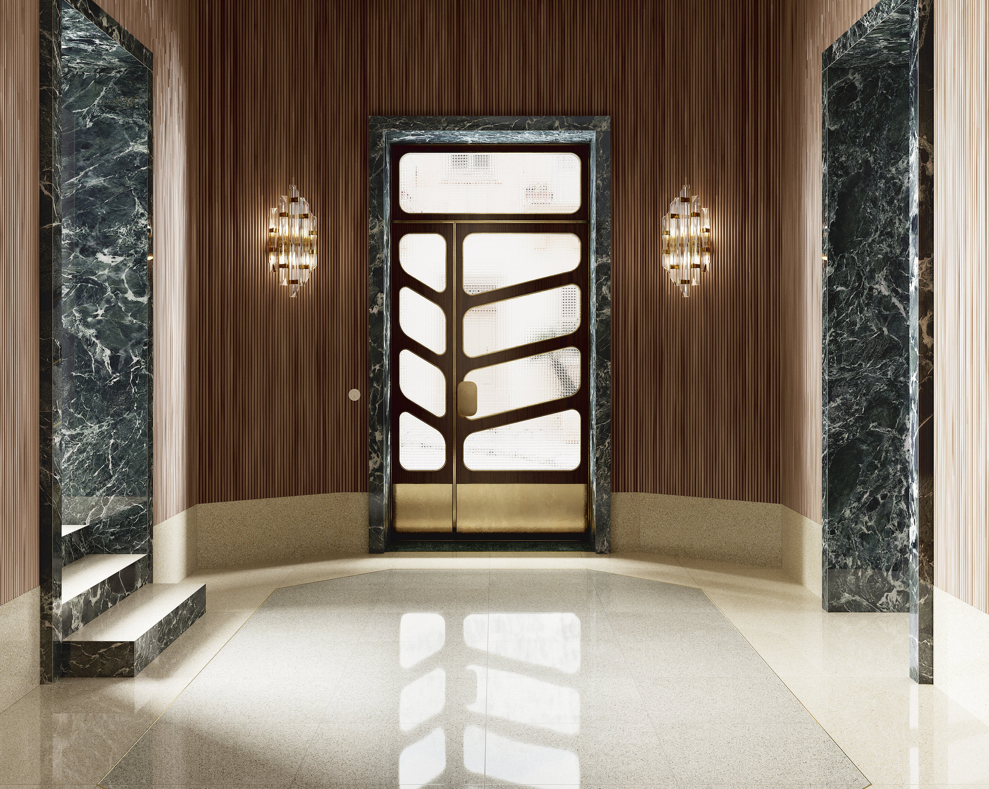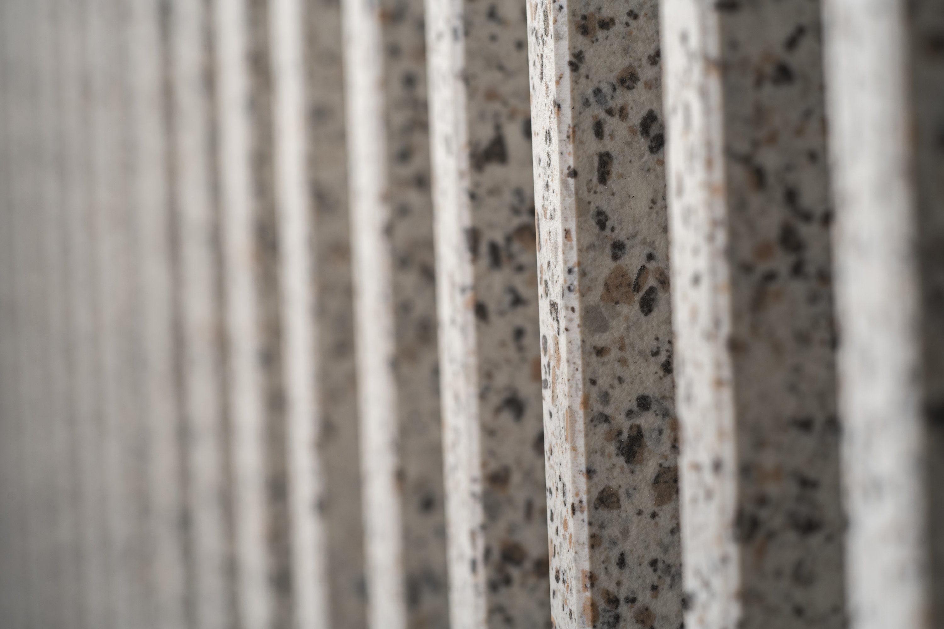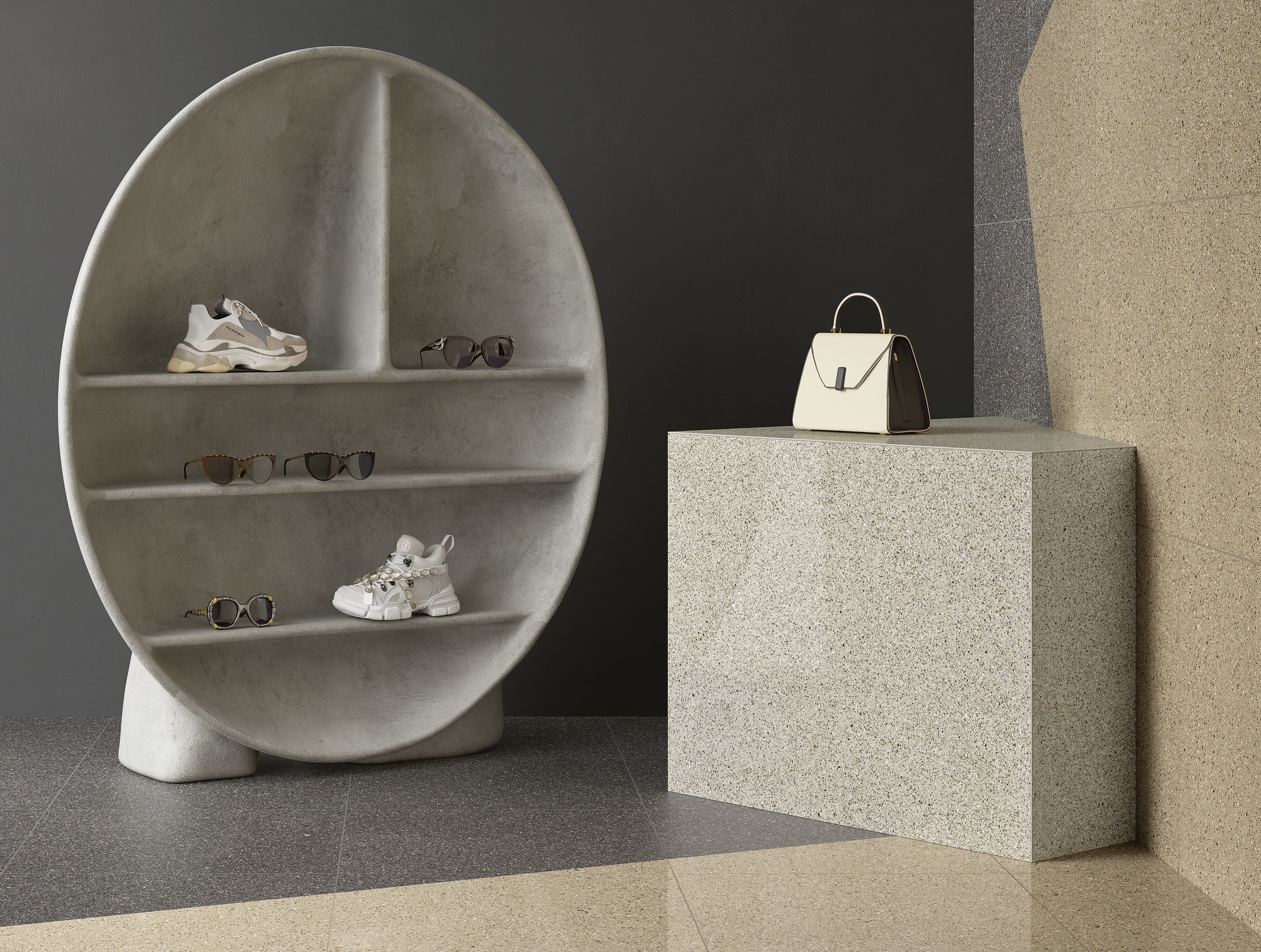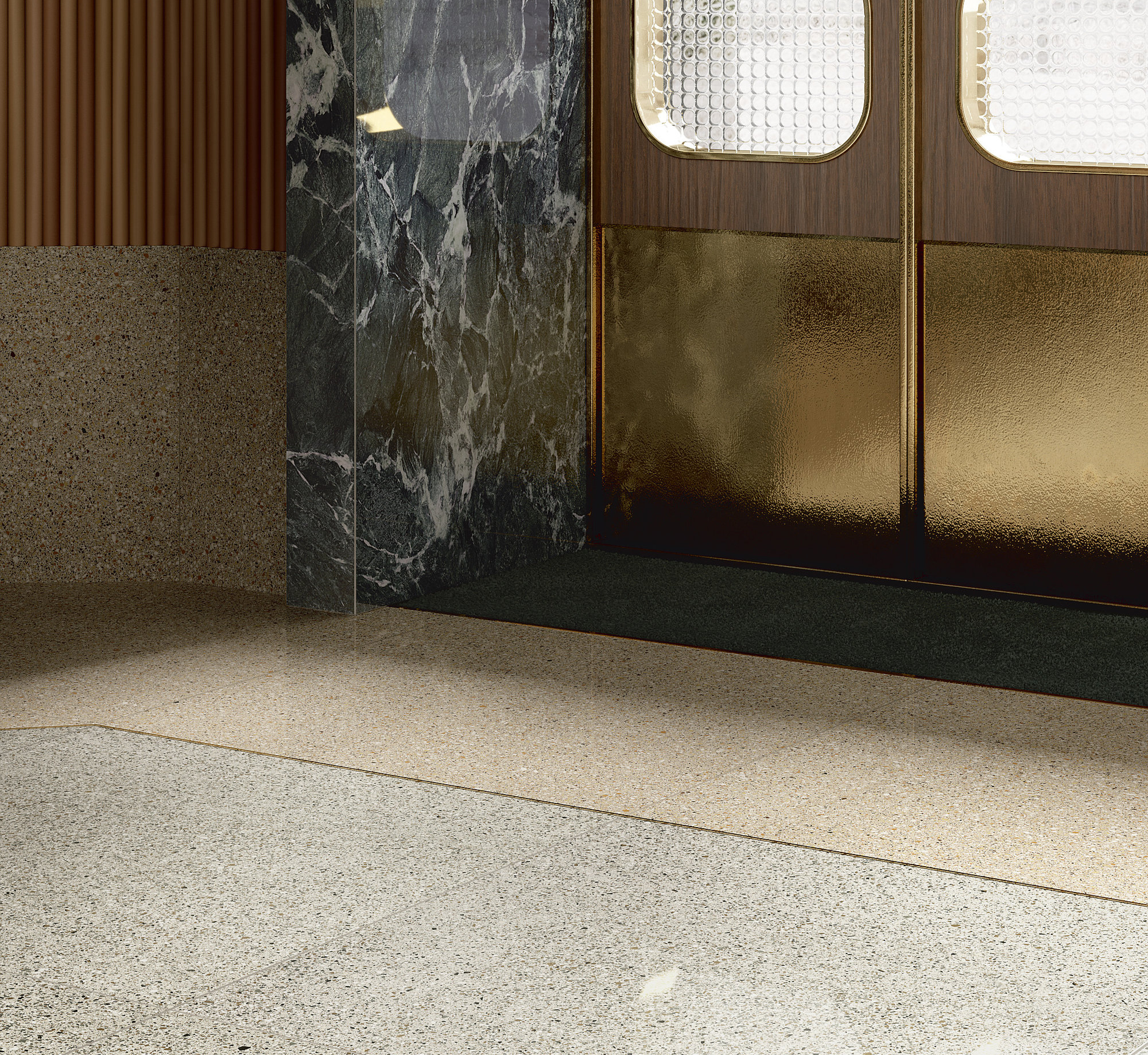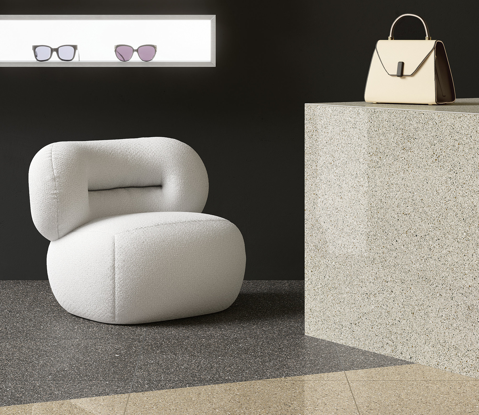 Le mélange ininterrompu d’éléments graphiques, dans une tonalité argentée, dégage des réverbérations presque astrales. Un équilibre impeccable existe entre points clairs et foncés, une correspondance fluide entre mille tonalités de gris qui rendent la surface dynamique, mais également discrète. L’espace absorbe et relâche dans le même temps son charme rétrofuturiste.