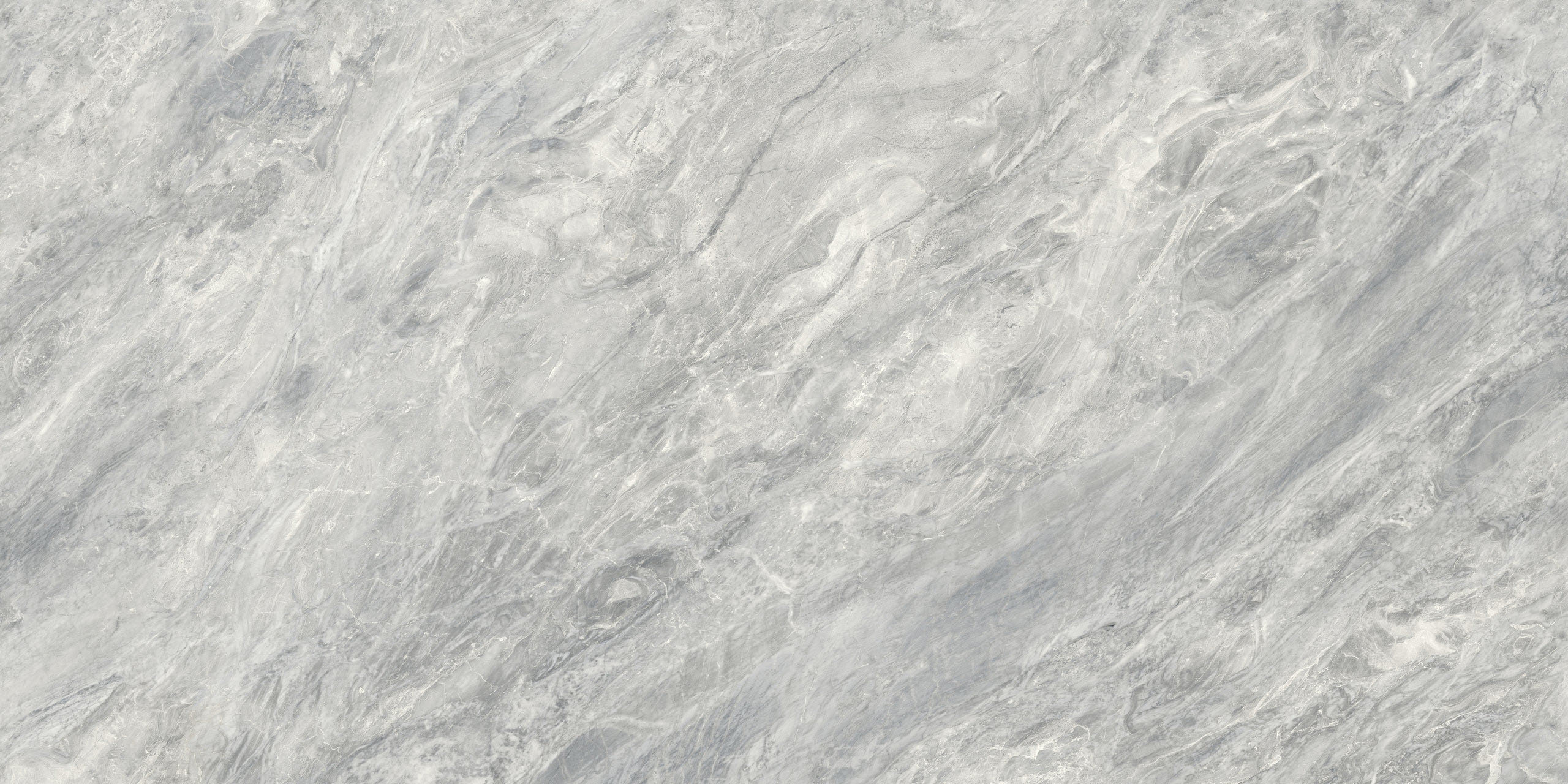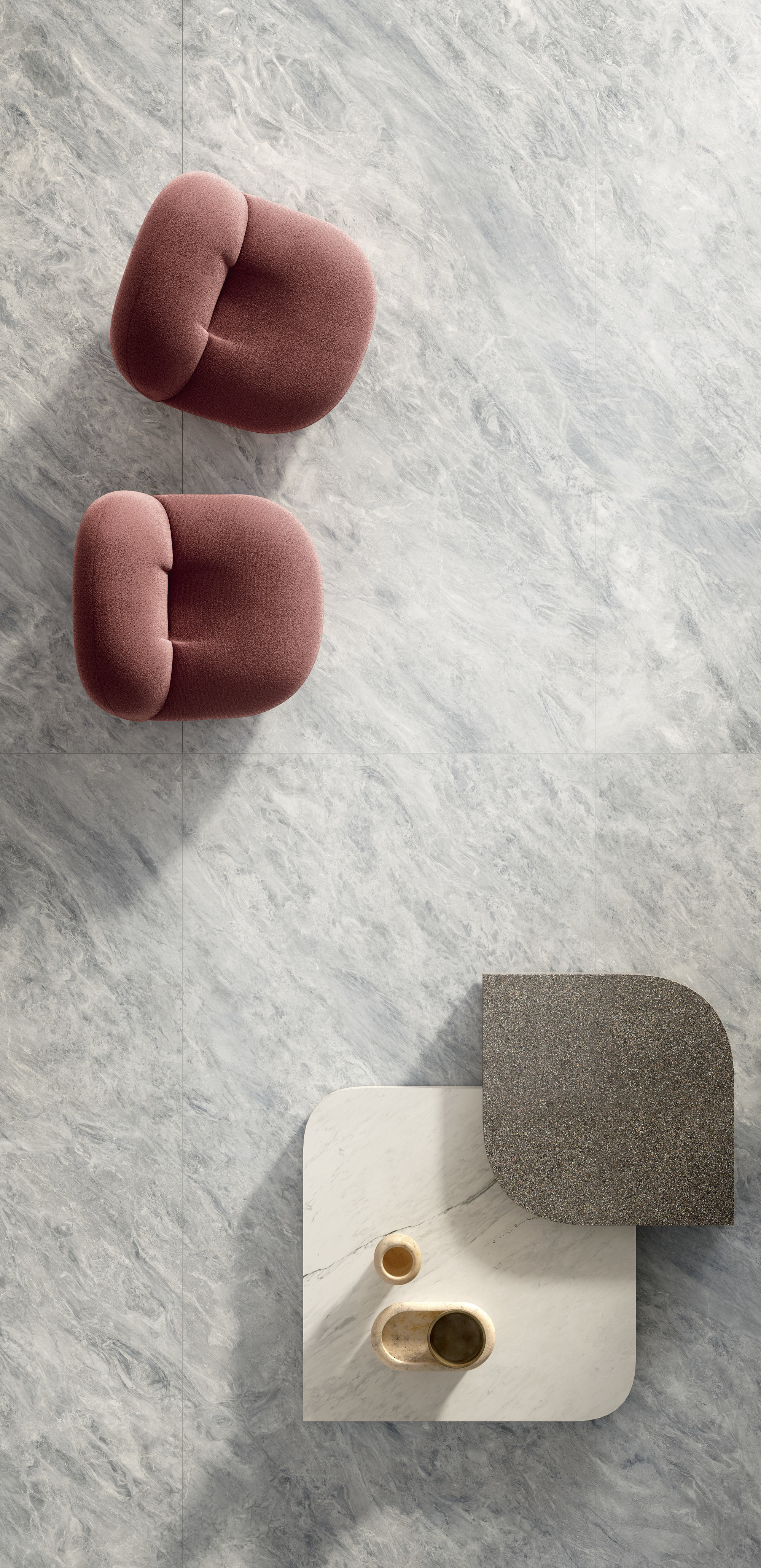 Un corps microcristallin, une âme vitreuse. Le fond gris ciel accueille le passage voilé de veines très vaporeuses et de veines filiformes. Le mouvement, presque parallèle, s’interrompt parfois comme une coupe de ciseaux de couture : ainsi, la texture effet nuage du marbre varie pour générer et régénérer ses stratifications.