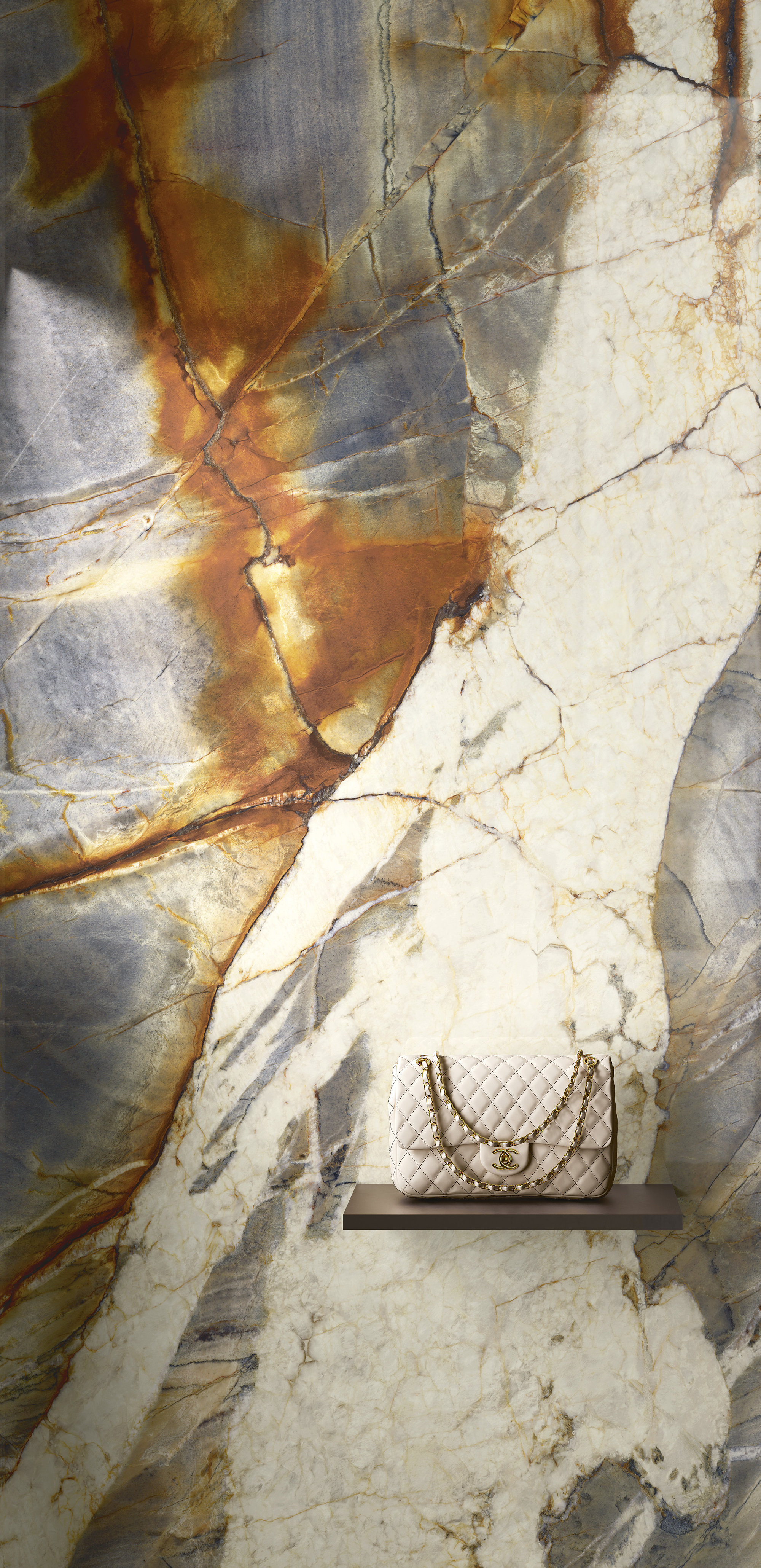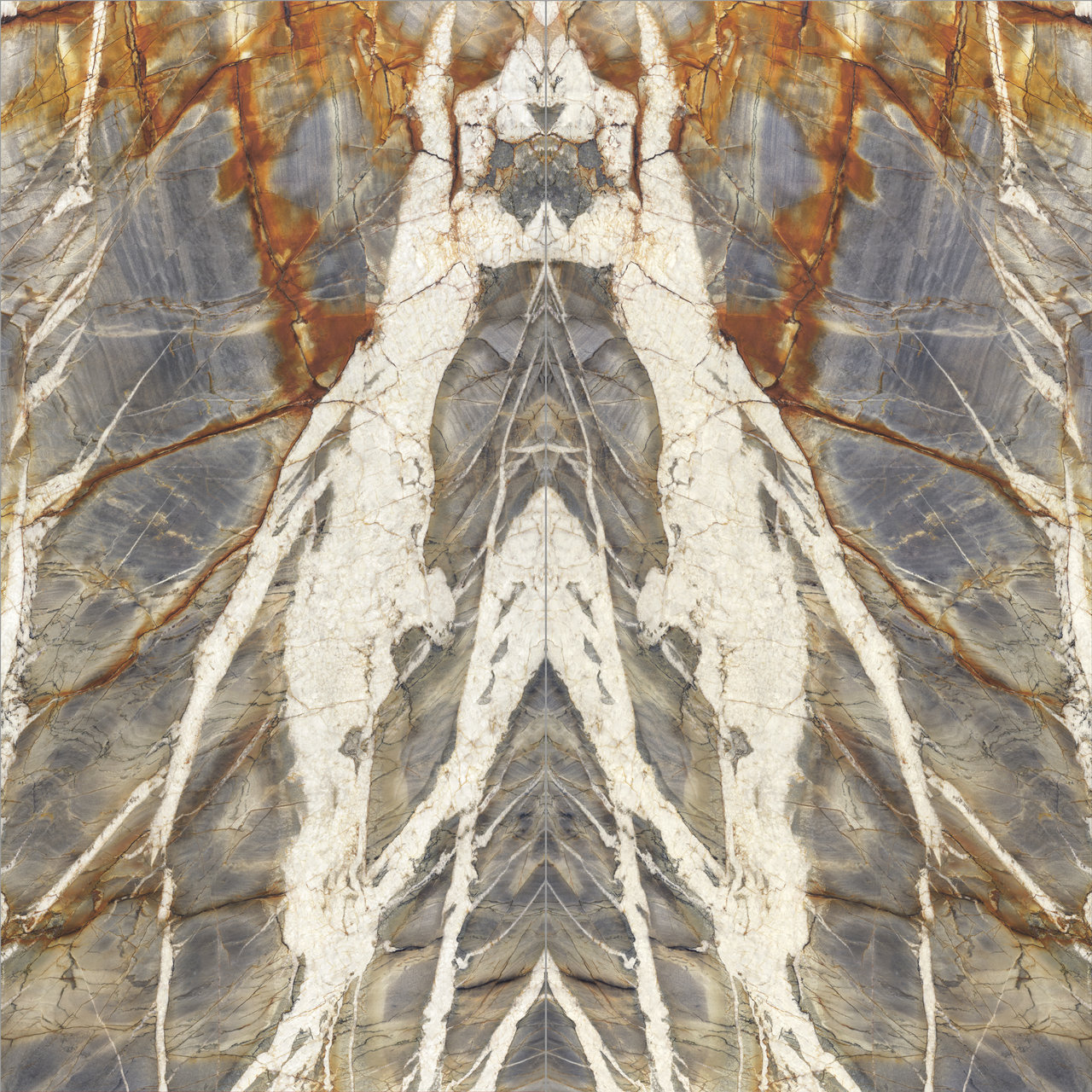 Un mélange chromatique d’une rare beauté pour un quartzite céramique extraordinairement impactant où le bleu, allant du ton le plus profond à la tonalité la plus claire, est ponctué de larges veines blanches et de touches marron et orange. Les faces « book-matched » créent des jeux de symétries rendus encore plus suggestifs par la finition lustrée. Une surface audacieuse et spectaculaire, pensée pour rendre mémorable chaque projet et aménagement.