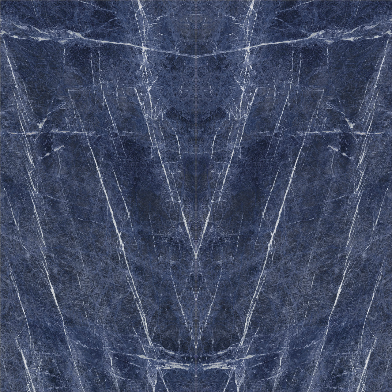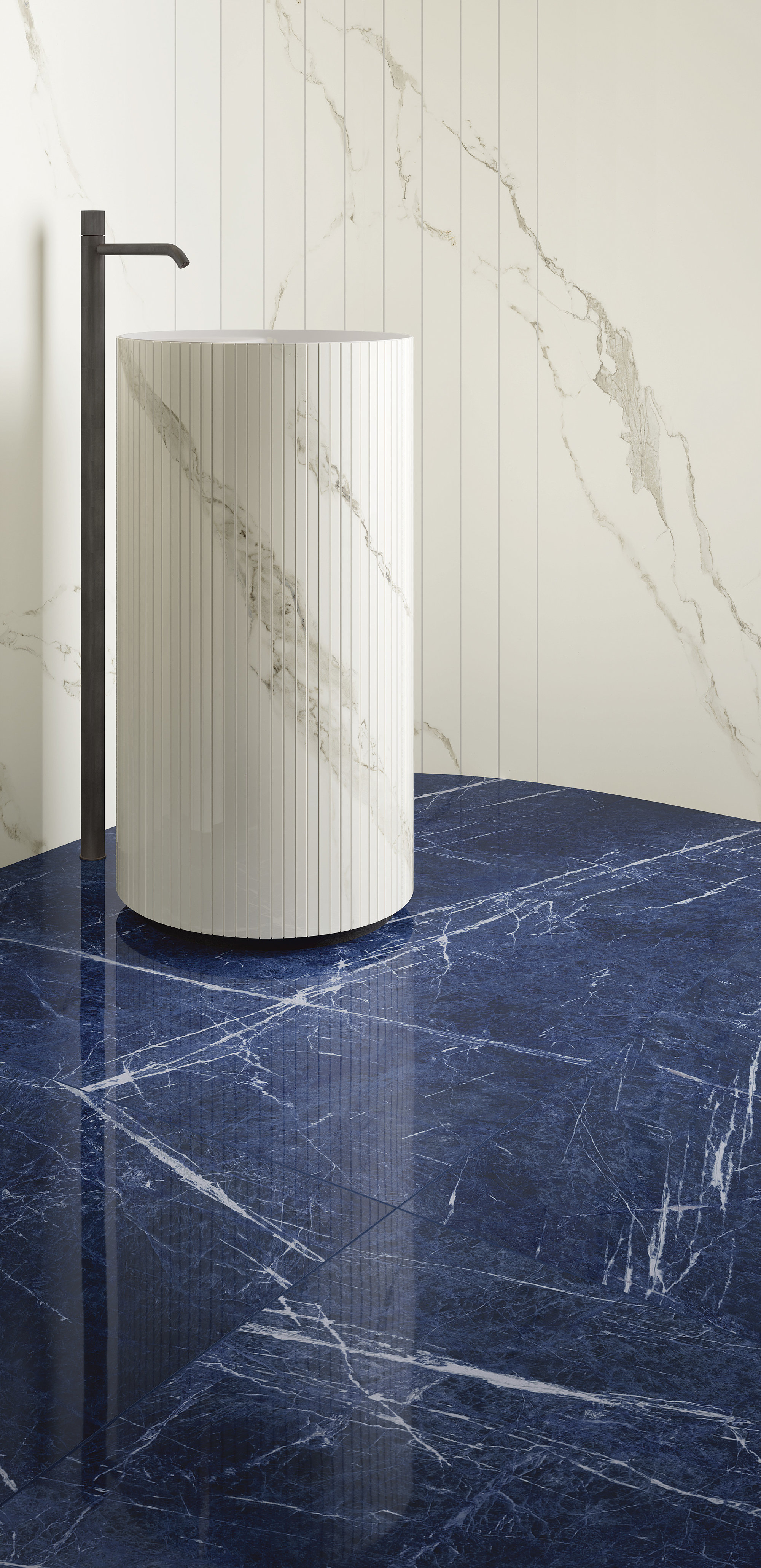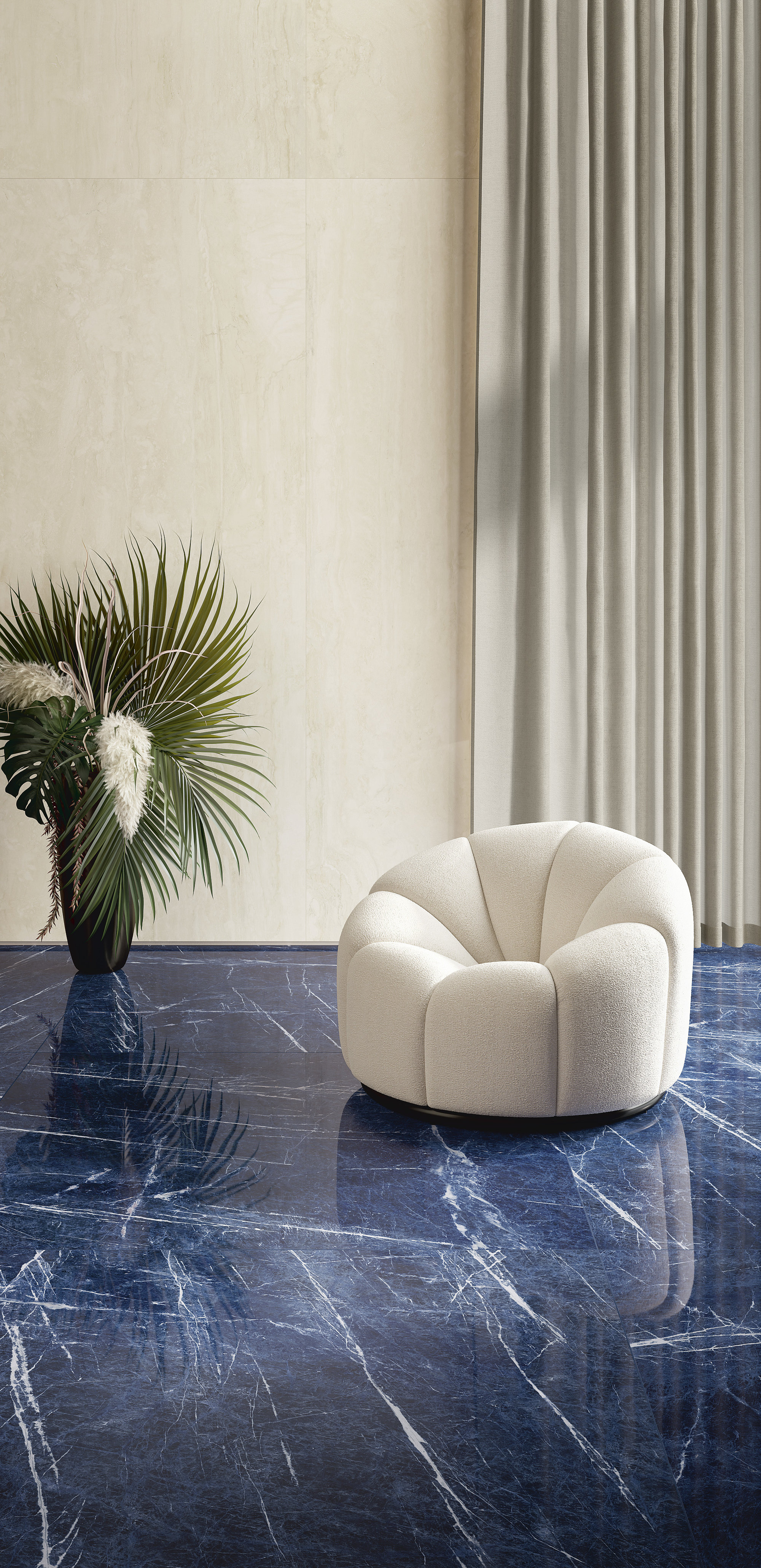 Cette surface en grès cérame effet marbre présente un fond bleu profond, enrichi de fines veines blanches qui créent un contraste raffiné et dynamique. Les veines irrégulières et lumineuses évoquent l’aspect du marbre précieux, conférant aux espaces une atmosphère recherchée et contemporaine. Disponible également en version « veine ouverte » (book-match).