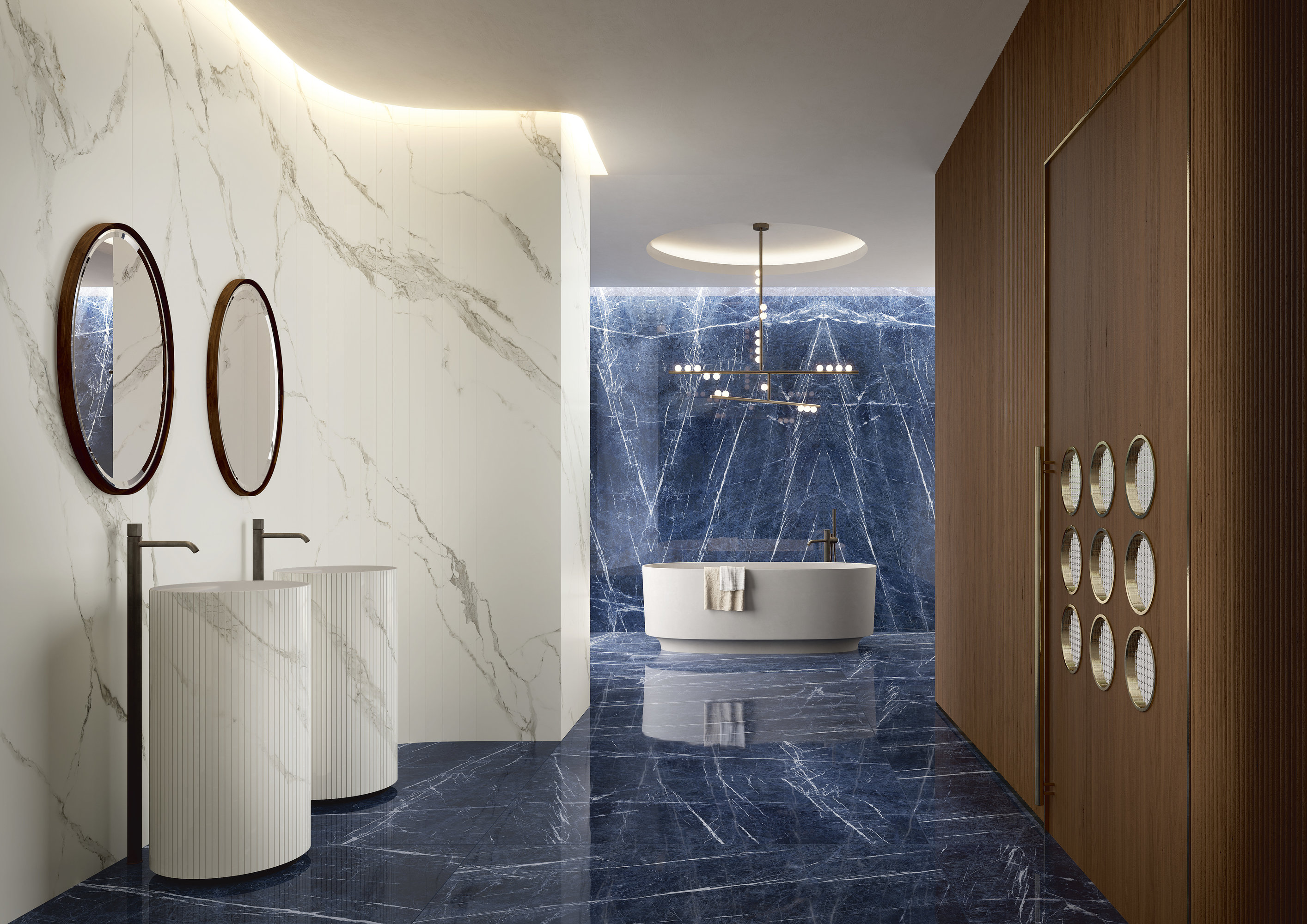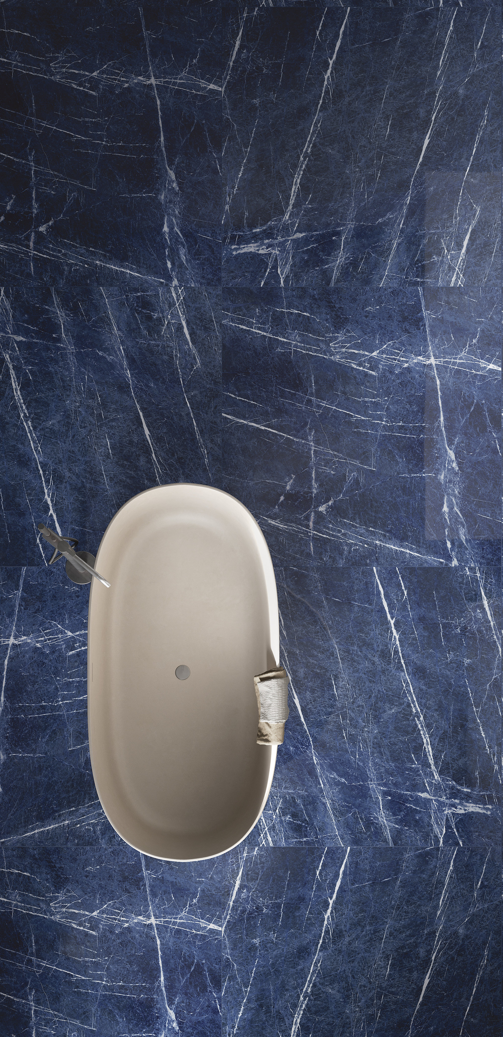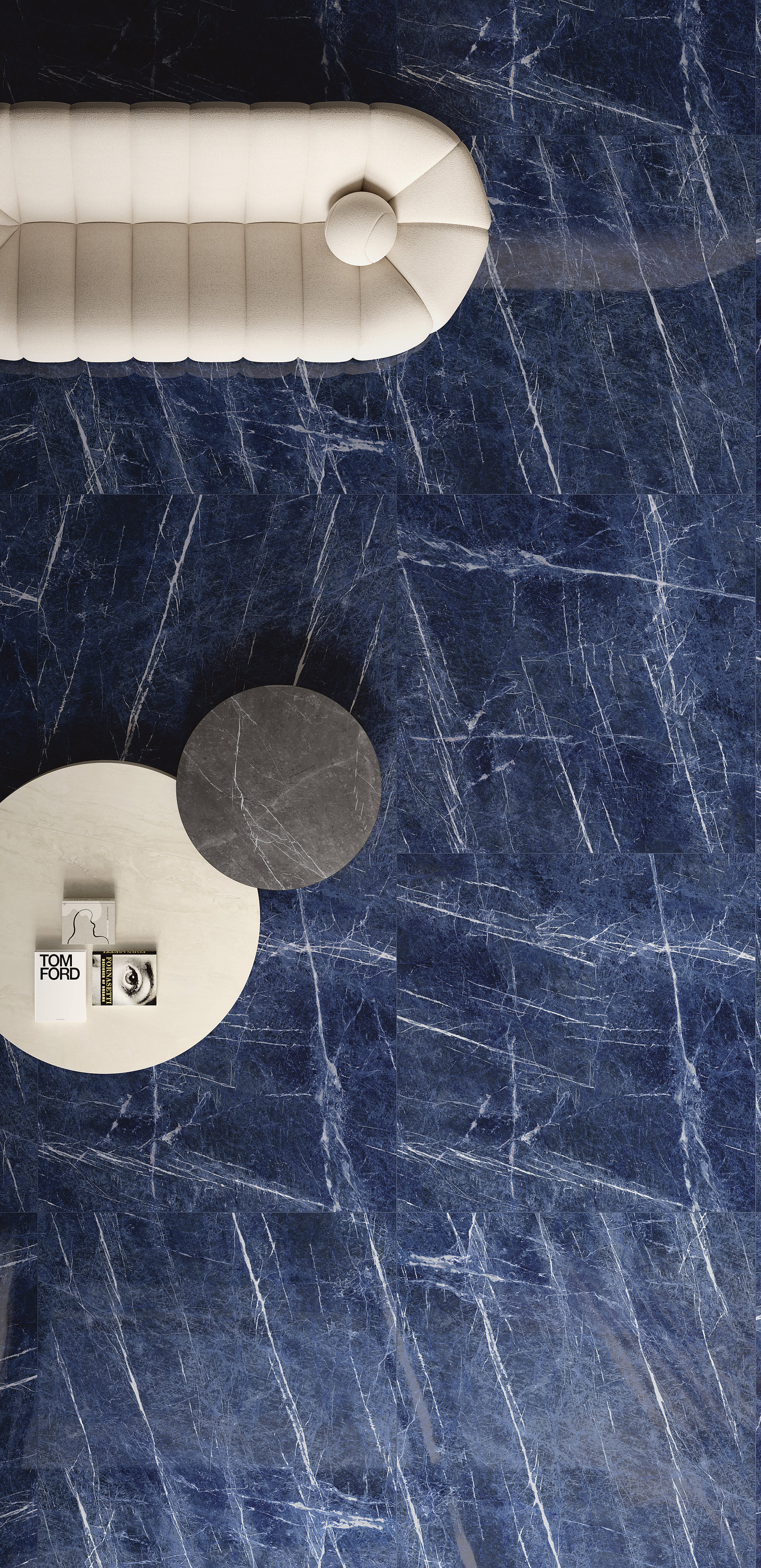 Cette surface en grès cérame effet marbre présente un fond bleu profond, enrichi de fines veines blanches qui créent un contraste raffiné et dynamique. Les veines irrégulières et lumineuses évoquent l’aspect du marbre précieux, conférant aux espaces une atmosphère recherchée et contemporaine. Disponible également en version « veine ouverte » (book-match).