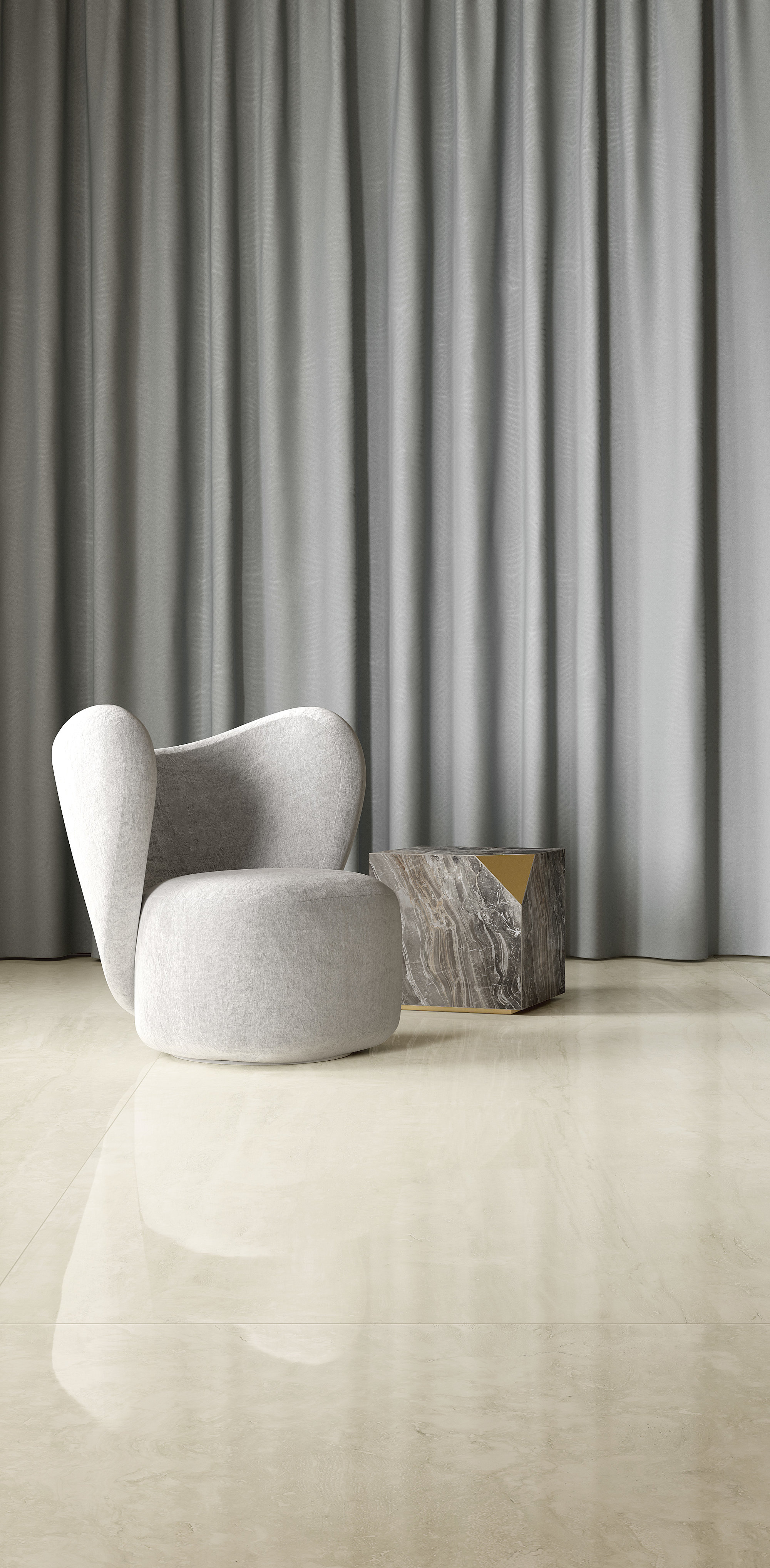Ethereal Travertino Maximum se caractérise par une teinte ivoire parcourue de fines veines. La finition polie d’Ethereal Travertino met particulièrement en valeur la douce texture nuageuse de la surface. Polyvalent pour des projets allant du style classique au style contemporain, Ethereal Travertino s’affirme comme un choix d’élégance intemporelle, apportant luminosité et chaleur aux espaces. Idéal pour des applications courantes telles que les sols et revêtements intérieurs, les façades extérieures, ainsi que pour le revêtement de mobilier.
