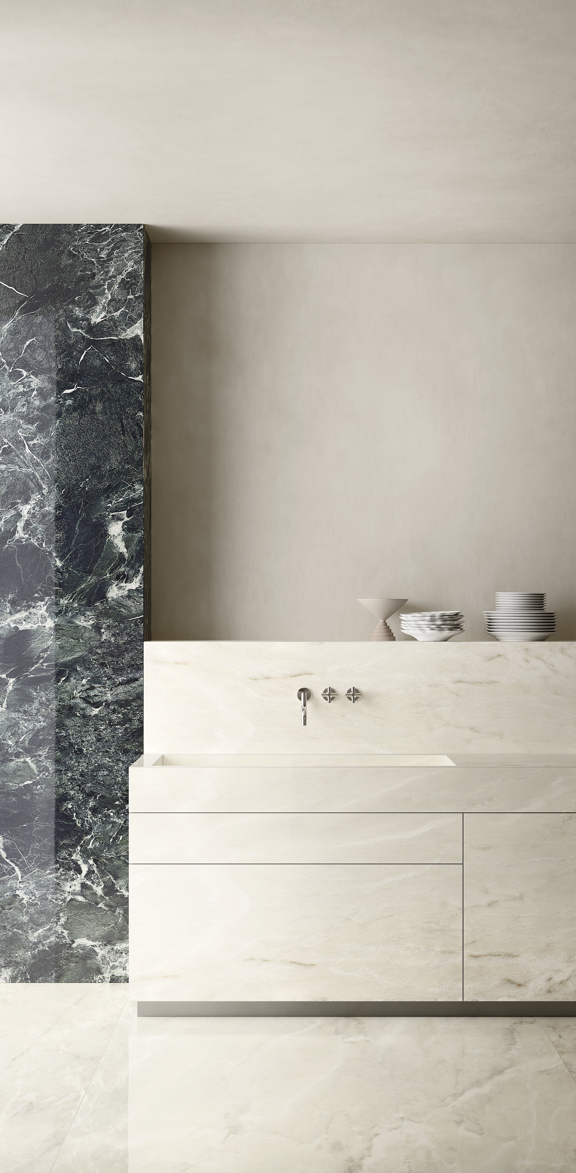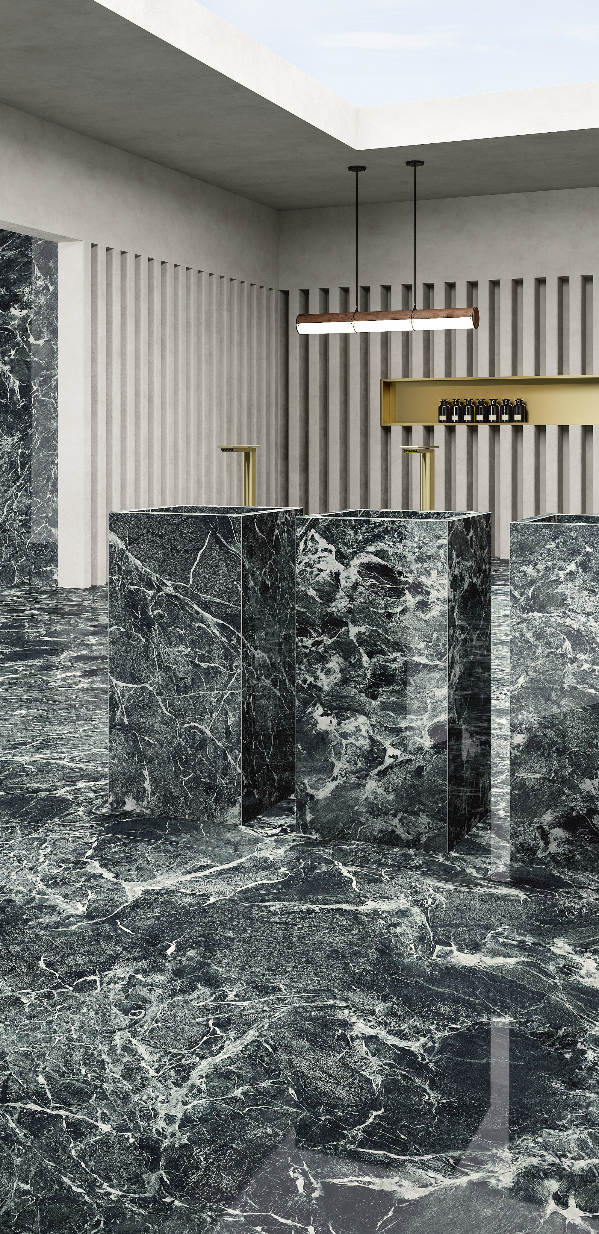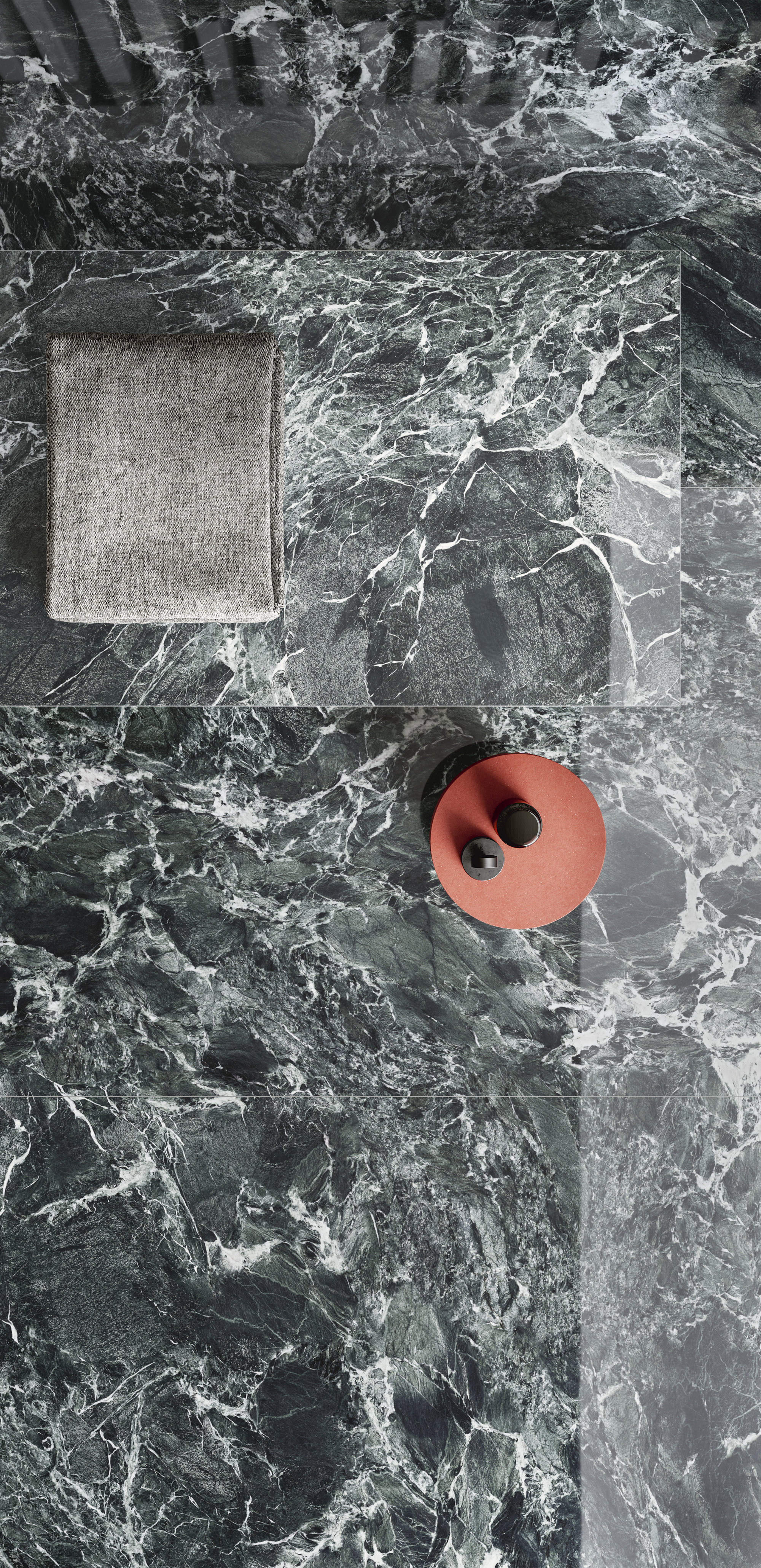 Alpi Chiaro Venato Maximum associe un fond vert intense à des veines blanches qui en soulignent l’élégance et la profondeur. Disponible en différents formats, il convient aux sols, revêtements muraux et meubles, tandis que les dimensions 270x120 et 120x120 cm sont conçues pour réduire les déchets et répondre aux standards les plus courants pour les murs et les receveurs de douche.