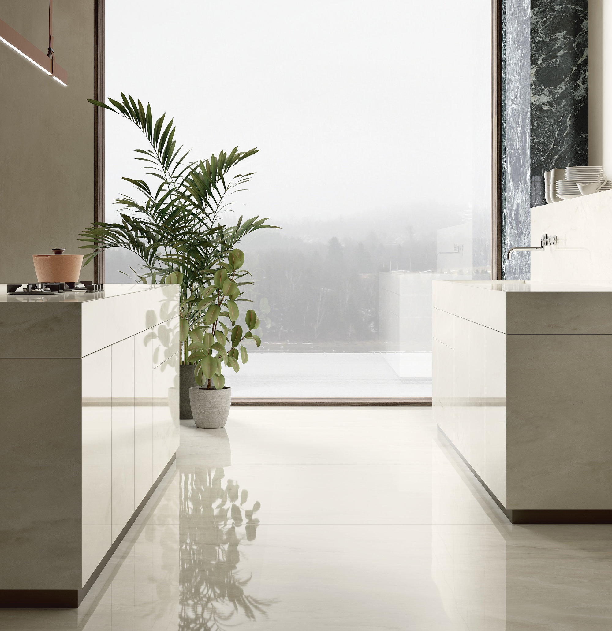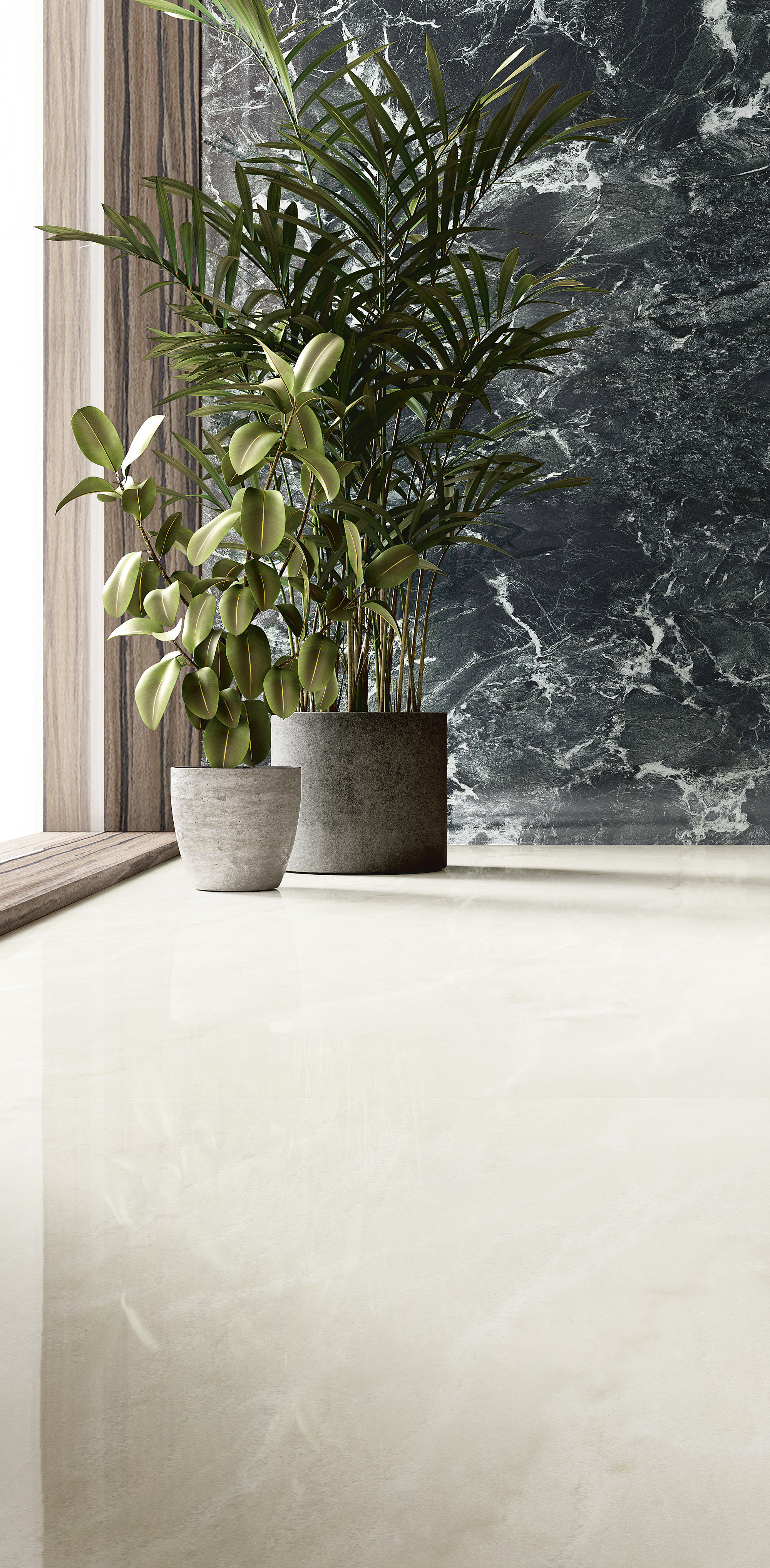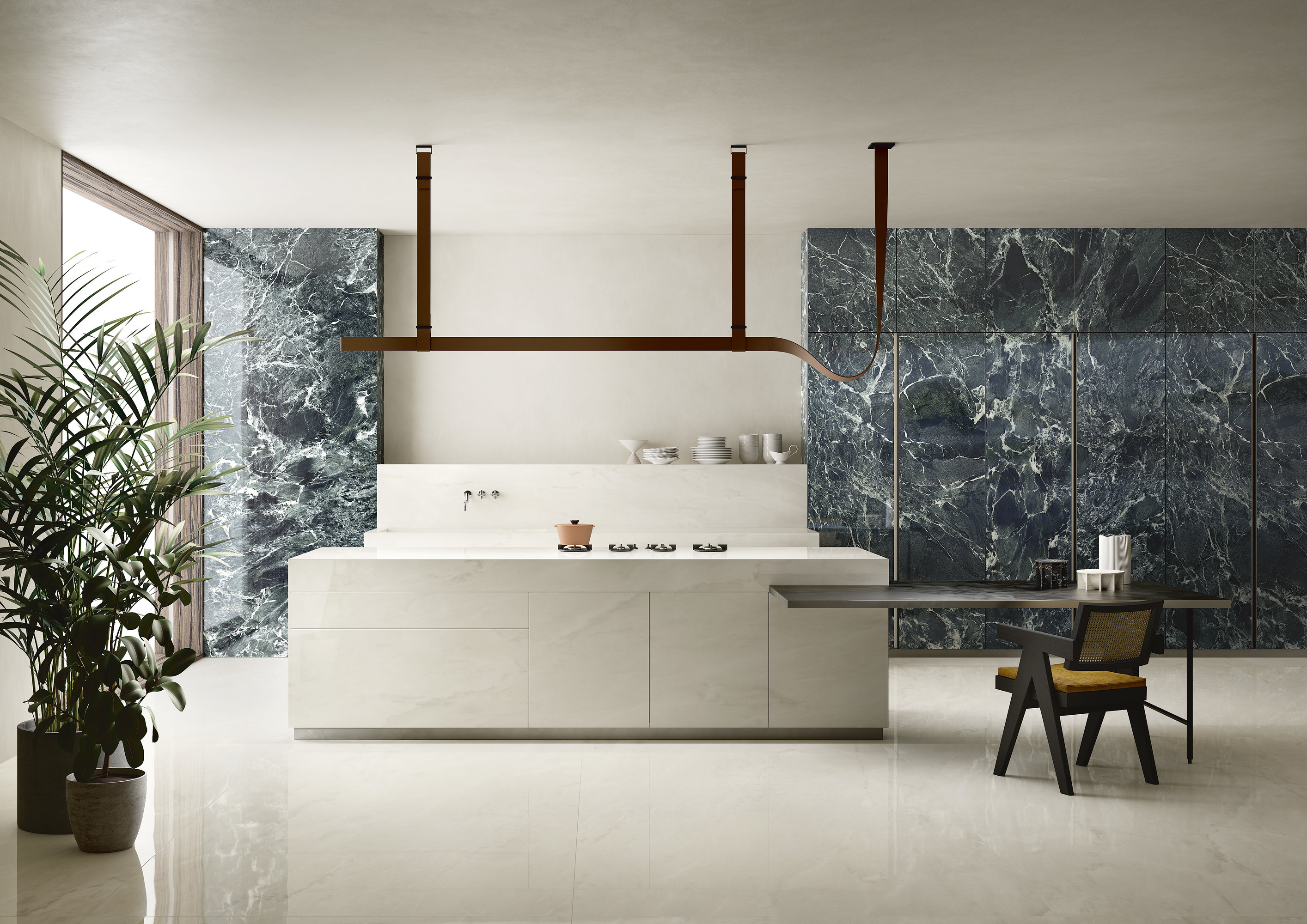 Alpi Chiaro Venato Maximum associe un fond vert intense à des veines blanches qui en soulignent l’élégance et la profondeur. Disponible en différents formats, il convient aux sols, revêtements muraux et meubles, tandis que les dimensions 270x120 et 120x120 cm sont conçues pour réduire les déchets et répondre aux standards les plus courants pour les murs et les receveurs de douche.