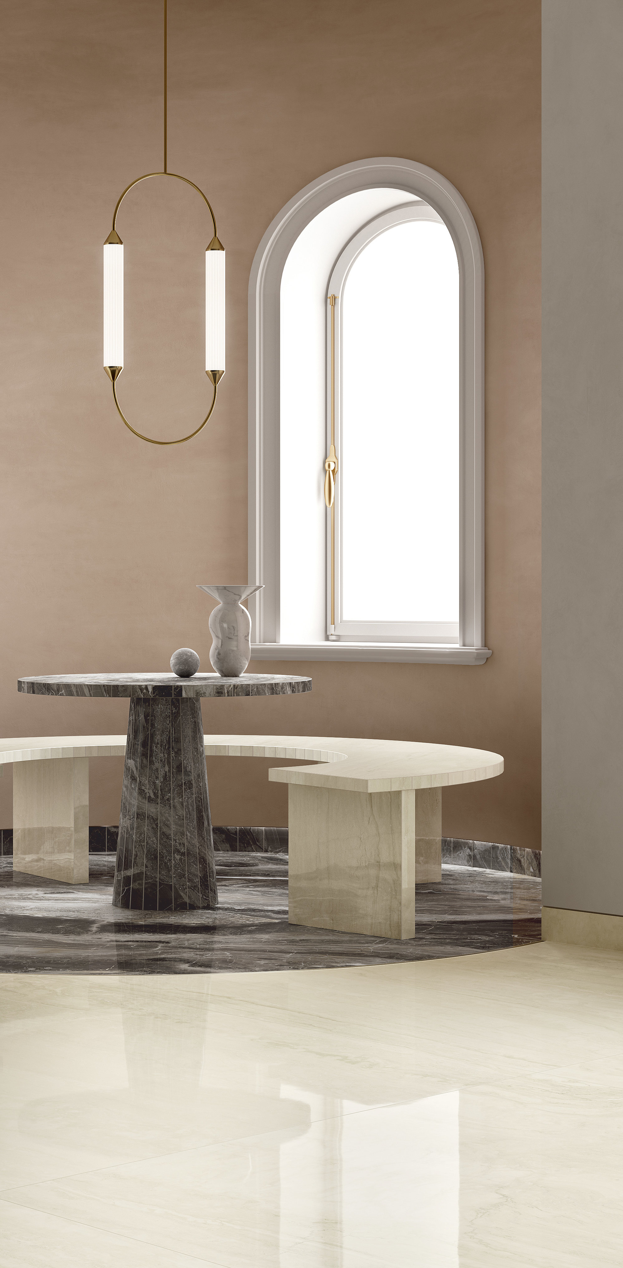 Des nuances de blanc, combinées à différentes teintes de gris et de brun et à de légères touches d’ocre, confèrent à Orobico Arabescato une esthétique vive et sinueuse. La finition polie met en valeur cette surface dans toute sa richesse ; disponible également en version veine ouverte (book-match), Arabescato Orobico est le choix idéal pour des architectures et intérieurs de prestige, qu’ils soient résidentiels, commerciaux ou publics. Outre les applications pour sols et revêtements, il est également possible de personnaliser le mobilier et les détails architecturaux.