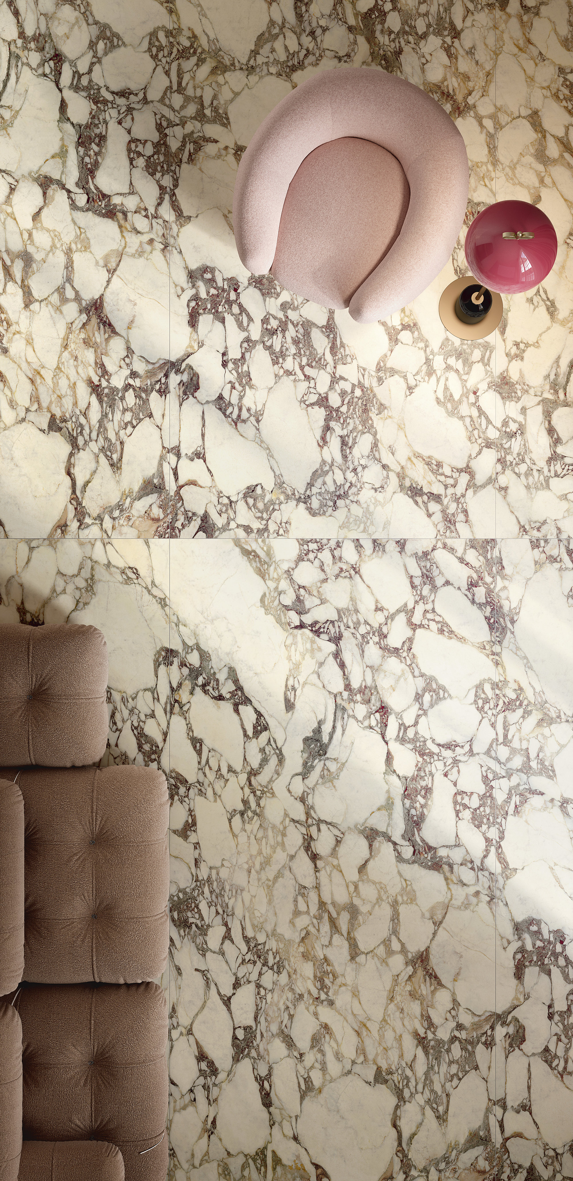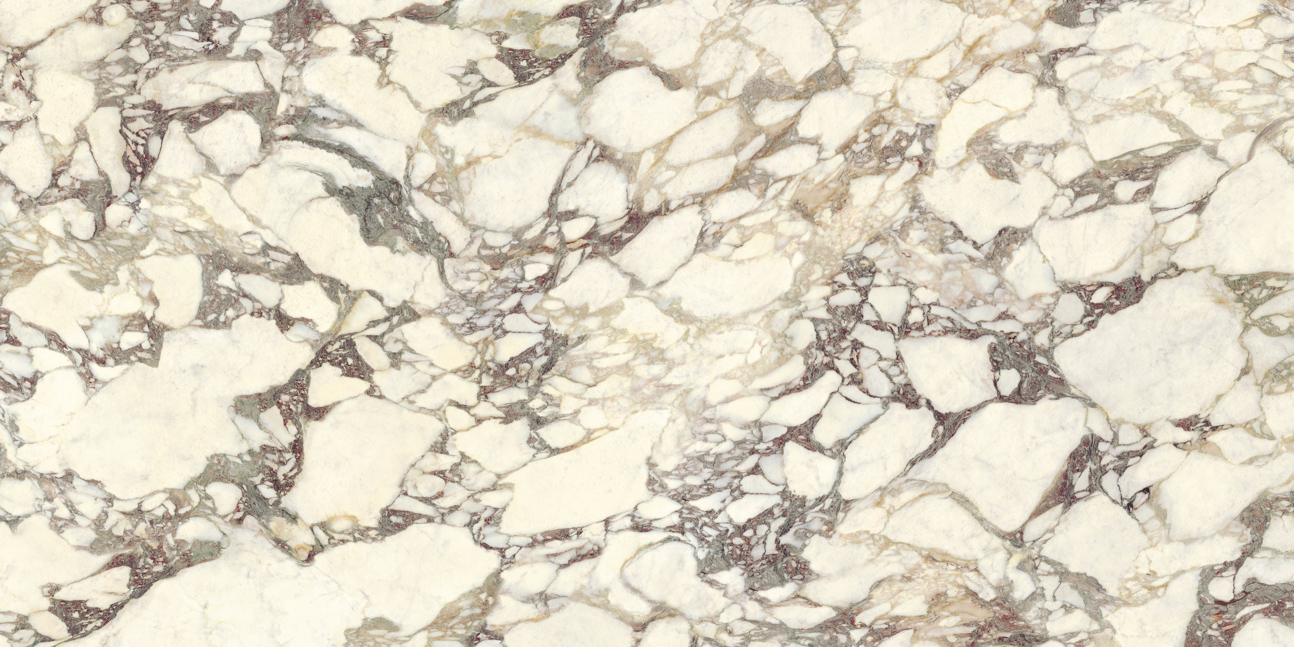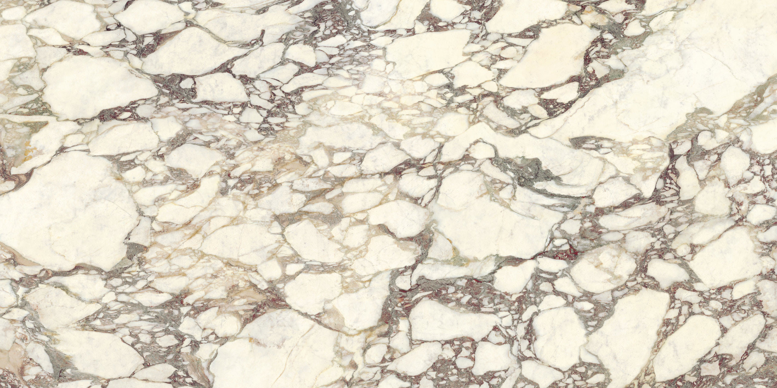 La structure largement veinée et son caractère noble évoquent les fastes anciens. Le liant, dans des tons violets classiques, dessine des formes libres sur le fond blanc chaud, tandis que les nuances vertes ou rosées se mêlent à des éclats presque dorés. La polychromie est parfaitement réussie. Disponible en formats classiques et Maximum.