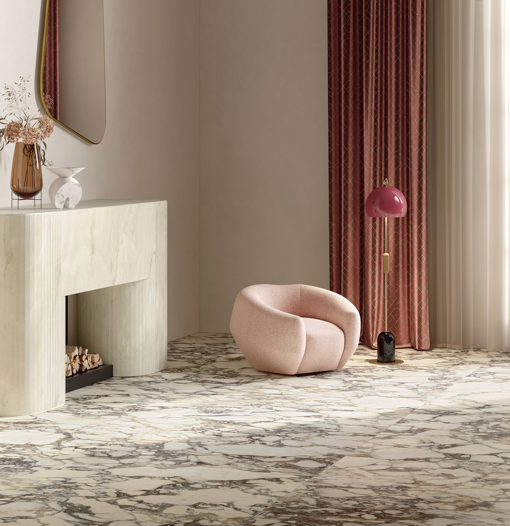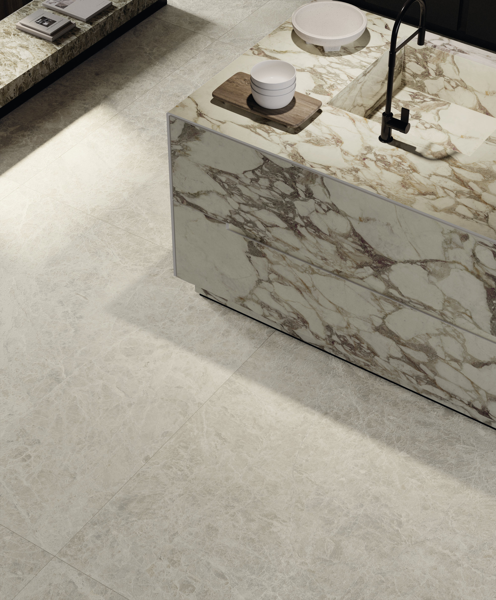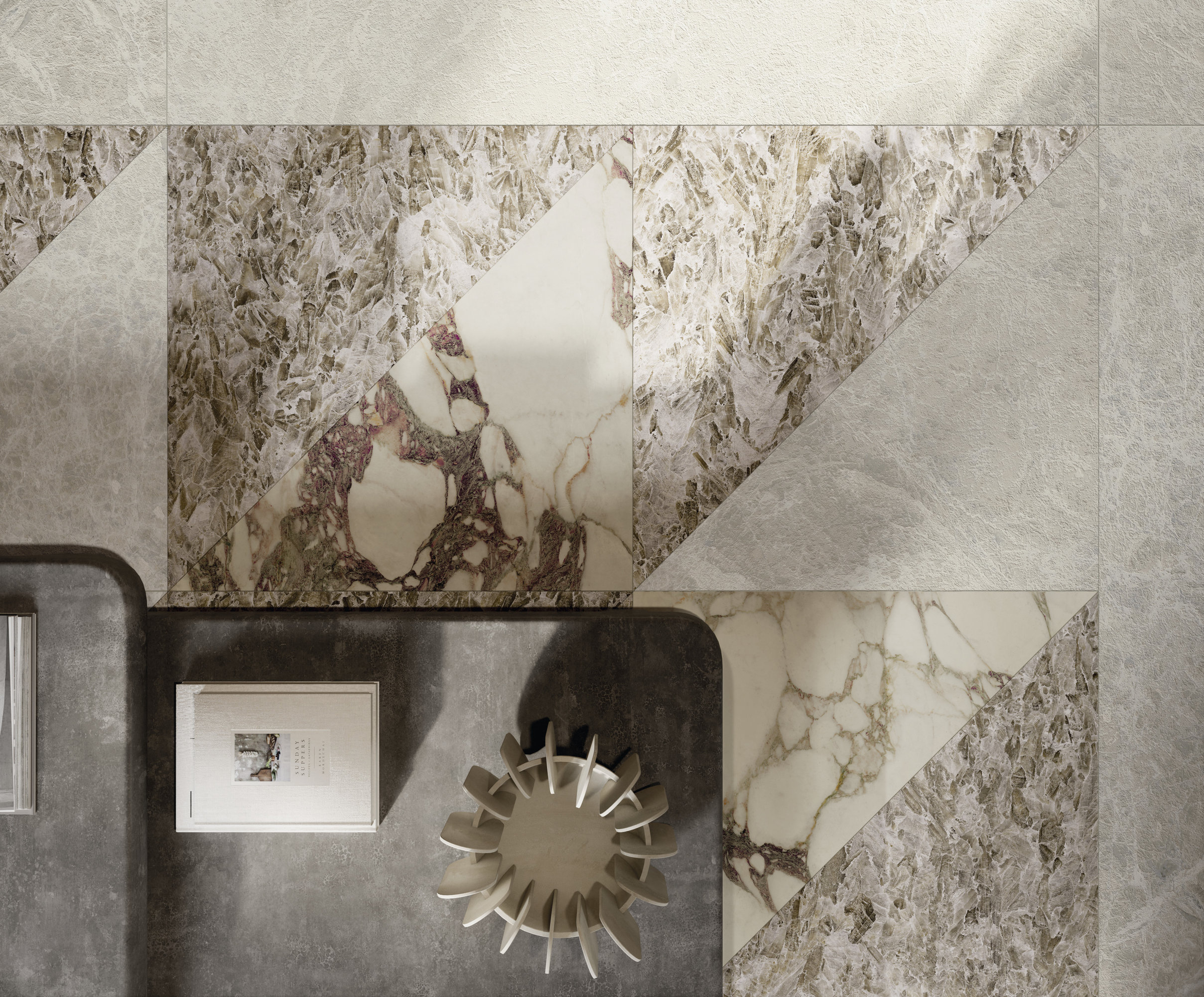 La structure largement veinée et son caractère noble évoquent les fastes anciens. Le liant, dans des tons violets classiques, dessine des formes libres sur le fond blanc chaud, tandis que les nuances vertes ou rosées se mêlent à des éclats presque dorés. La polychromie est parfaitement réussie. Disponible en formats classiques et Maximum.