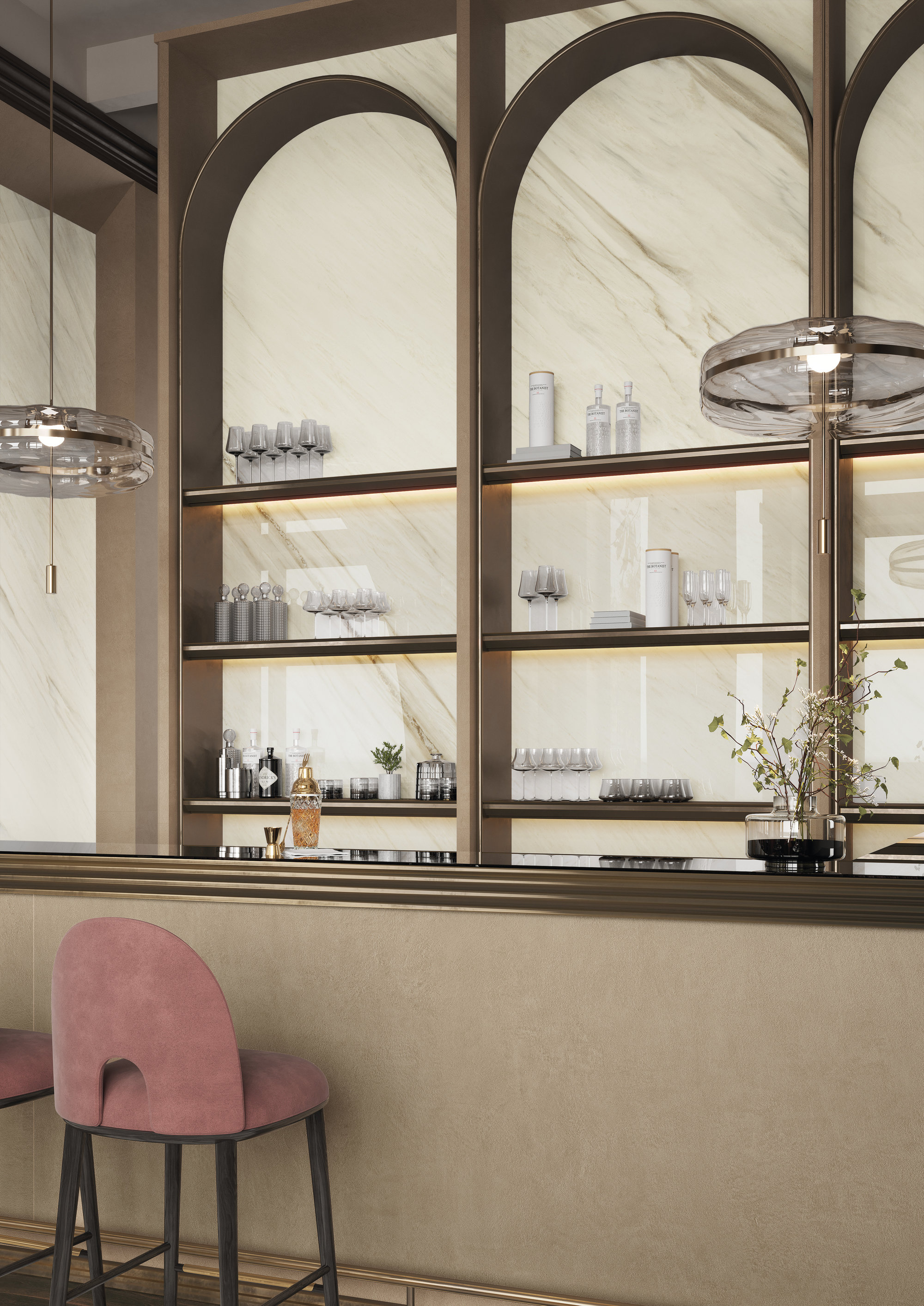 Les nombreuses stries fines de cette texture blanche puisent leur mémoire dans le temps. Avec leurs tonalités marron et gris foncé, les veines qui la traversent varient dans d’innombrables gradations, créant une trame ondulée qui se traduit en beauté, en singularité et en émotion. Avec son effet doux et enveloppant, Palissandro White Maximum est idéale pour les sols et les revêtements, mais également pour rehausser les meubles. Pour l’illuminer, la finition exclusive glint diffuse des pigments lumineux de manière uniforme, ajoutant une touche d’audace à la texture.
