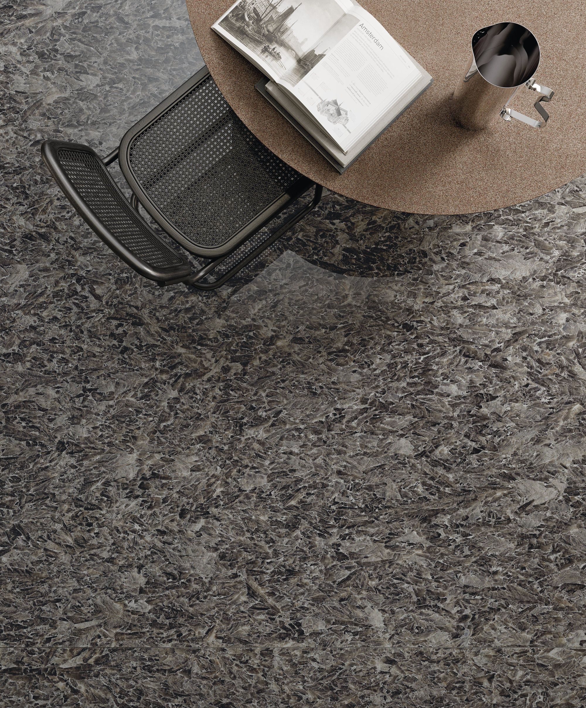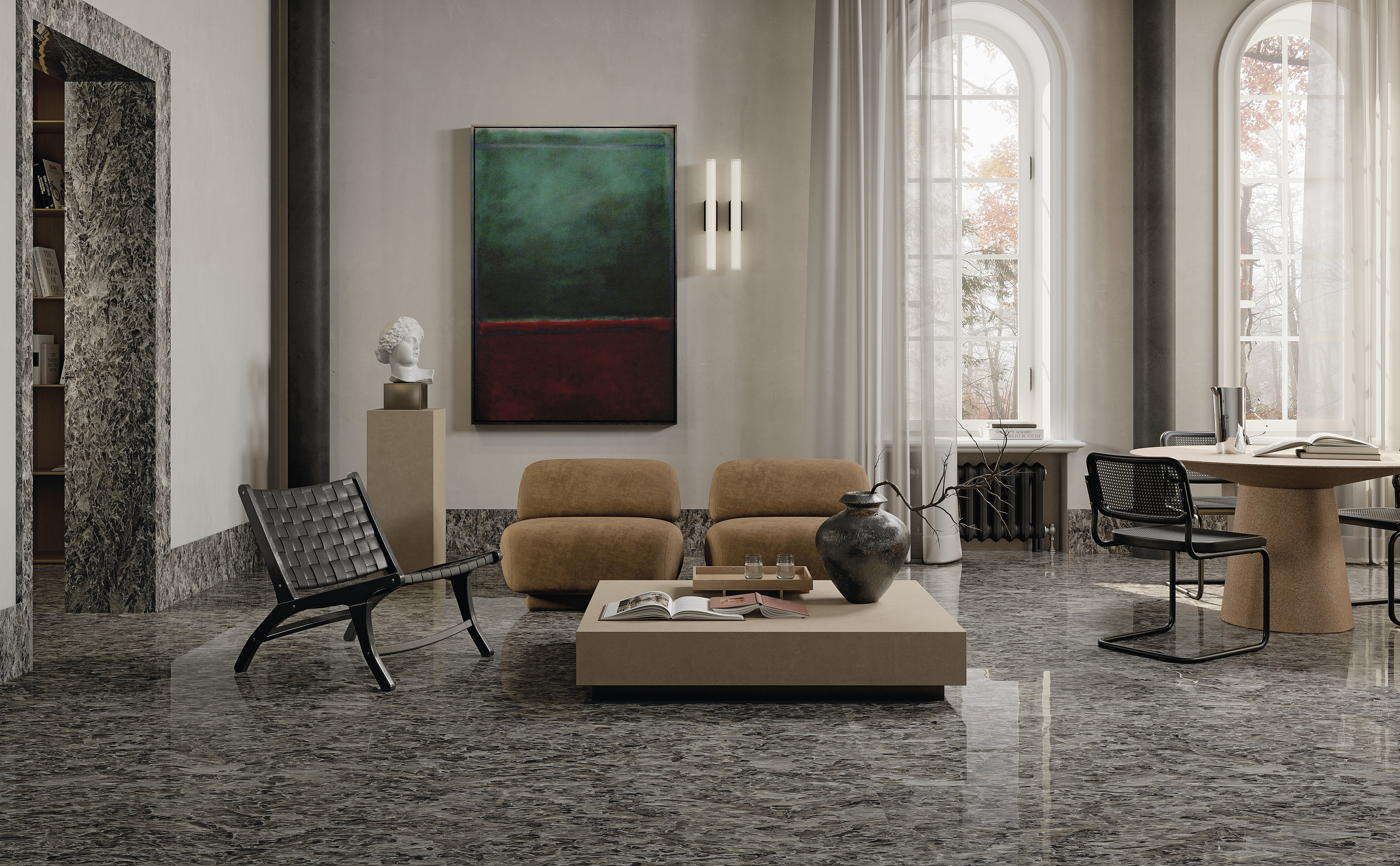 Conférant aux espaces élégance et rigueur, le noir est illuminé par des inclusions plus claires et nuancées. Visuellement enveloppantes grâce aux réfractions cristallines, les surfaces surprennent par leurs traits graphiques tandis que la finition exclusive Jewel, grâce à une entente alchimique entre un minéral irisé et un matériau vitreux, met en exergue les fragments lumineux et insuffle encore plus de netteté et d’intensité à la matière céramique pour une expérience architecturale toute en émotions.
